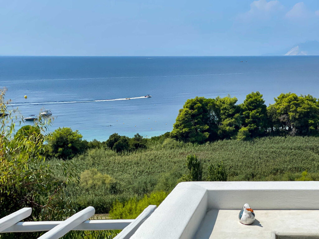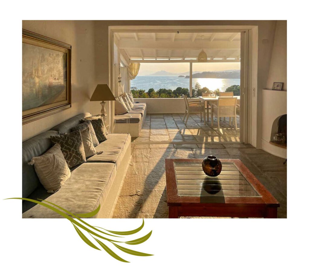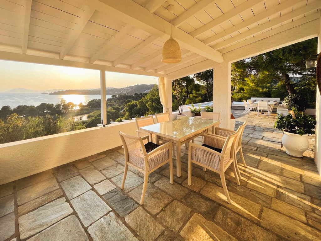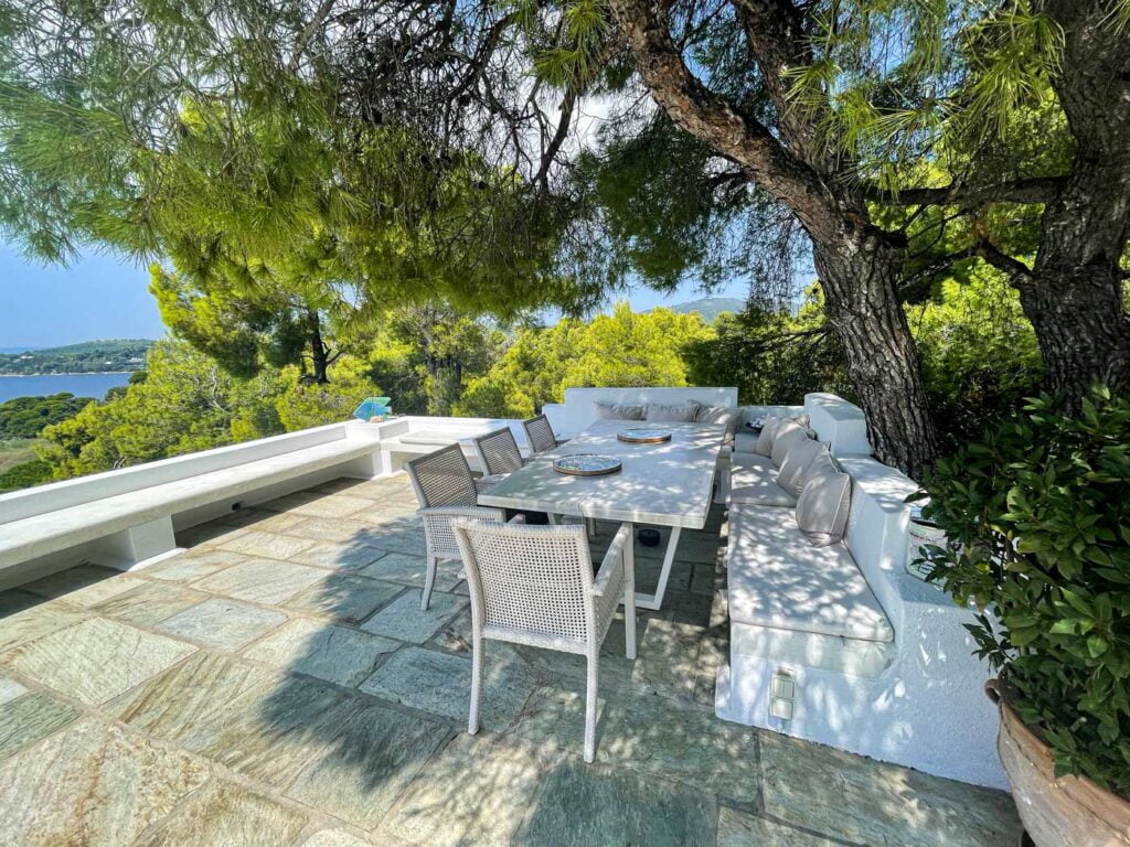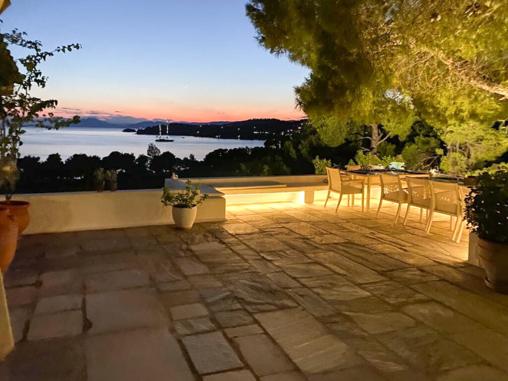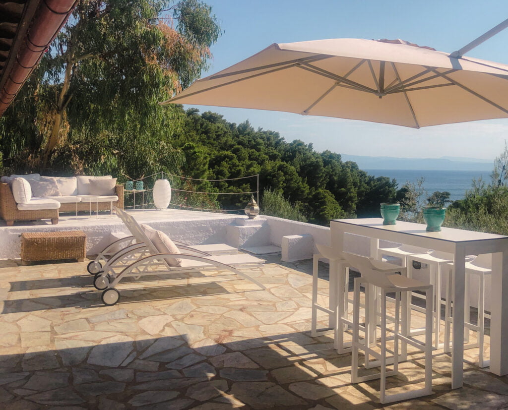 Die geräumige VILLA AGLAIA befindet sich an einem der schönsten Sandstrände auf Skiathos. Die Villa hat eine Hanglage, Süd-Westlage mit erstaunlichem Sonnenuntergang. Voller Meerblick von allen Zimmern. Die Villa erstreckt sich über 3 Wohn- und 4 Terrassenebenen. Der Strand ist über Treppen direkt über den privaten Garten erreichbar.